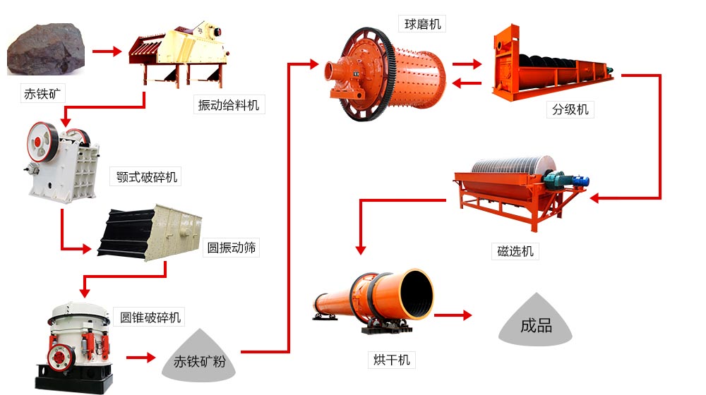 首先磁鐵礦由振動給料機均勻的送到顎式破碎機進行初破,初破后的磁鐵由皮帶輸送機進行二破,二破后的磁鐵由圓振篩進行篩選,不合格返回圓錐破碎機繼續(xù)破碎,合格的被送到球磨機進行研磨,研磨后的磁鐵礦粉磨被送到分級機進行分選,不合格的被返回繼續(xù)研磨,合格的被送到磁選機進行磁選,磁選后的物料經脫水干燥后近視我們所要的產品。