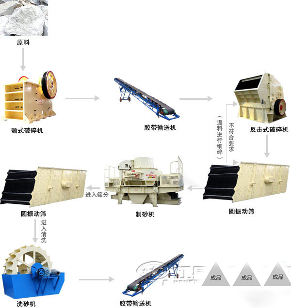二次破碎后的白云石顆粒被送到圓振動(dòng)篩進(jìn)行篩分,粒度大小合格的被送到細(xì)碎環(huán)節(jié),不合格被返回反擊式破碎機(jī)繼續(xù)破碎,合格的白云石顆粒由沖擊式破碎機(jī)進(jìn)行細(xì)碎整形,細(xì)碎后送到圓振動(dòng)篩進(jìn)行篩分,合格的送到制砂機(jī)進(jìn)行清洗除雜,不合格返回沖擊式破碎機(jī)繼續(xù)破碎,清洗過(guò)后的白云石顆粒經(jīng)過(guò)脫水烘干后盡可以投入工業(yè)中。